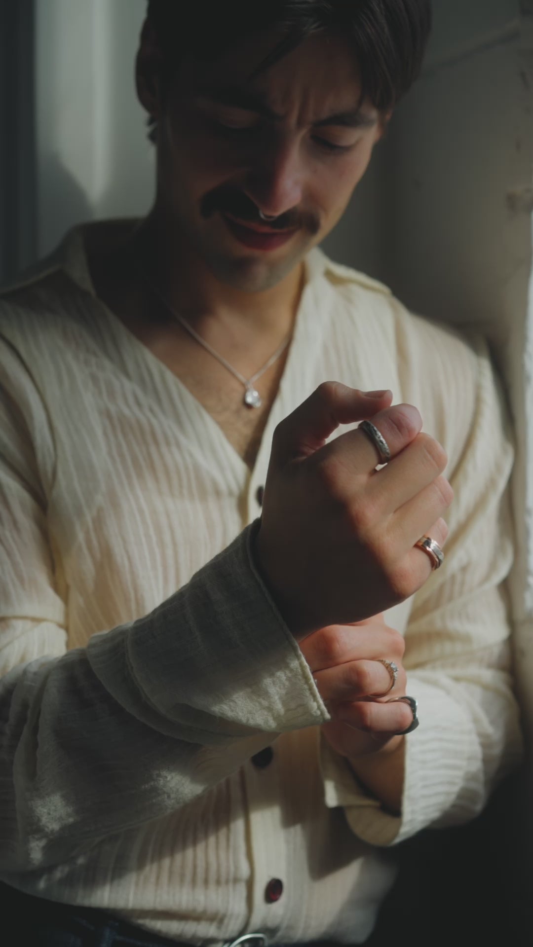This dual-textured band is created using Fairmined Certified sterling silver. With a carved texture on one side and a polished bevel on the other, this ring is both classic and dynamic.